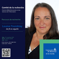 Le comité de la recherche de l'EBSI vous convie à son tout premier séminaire de l'automne 2025. Nous aurons la chance de recevoir Constance Poitras,...